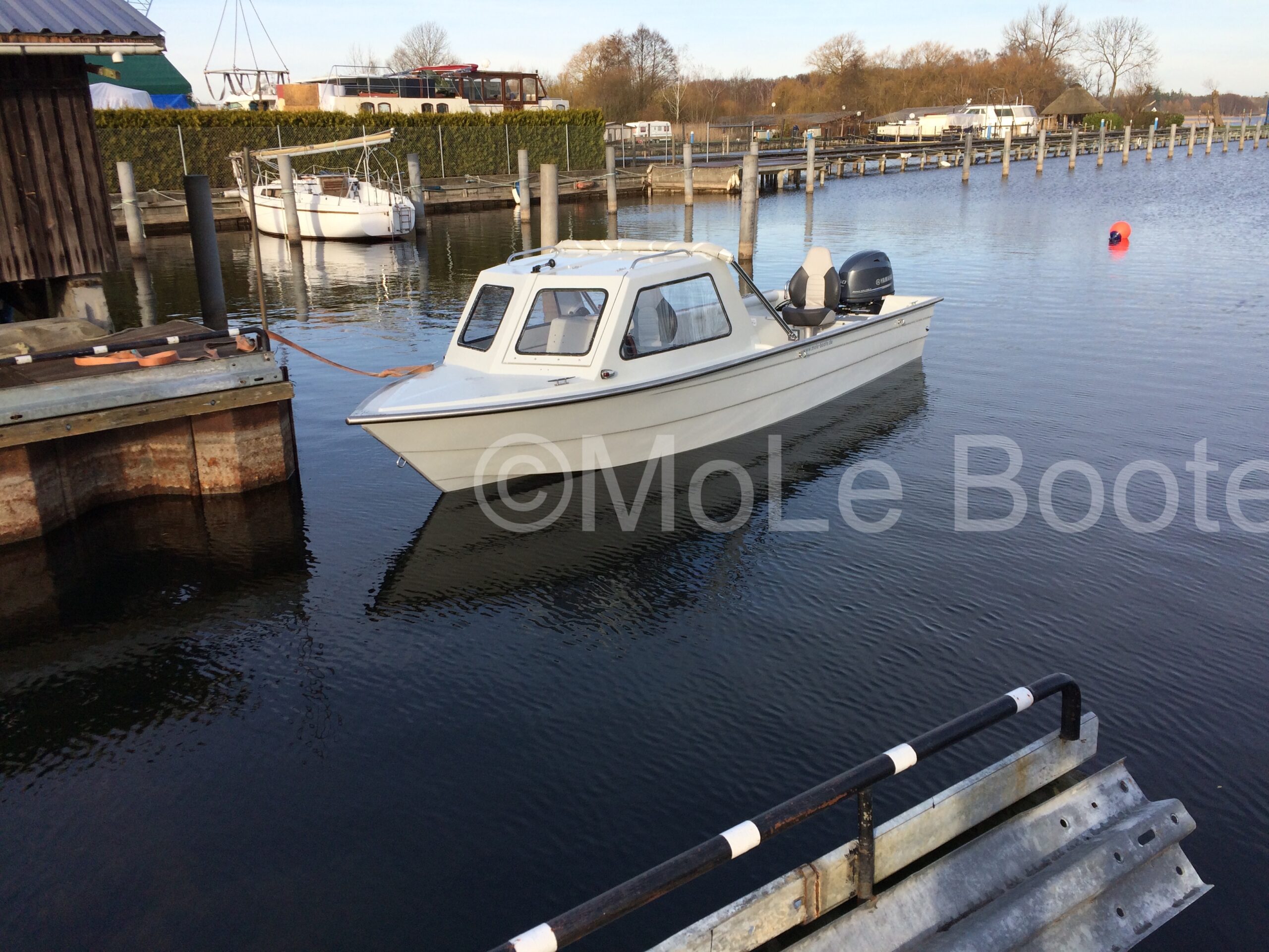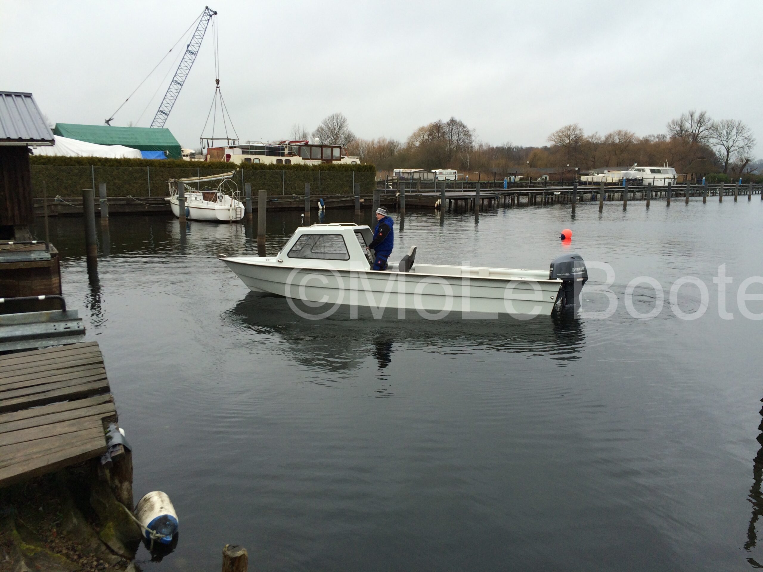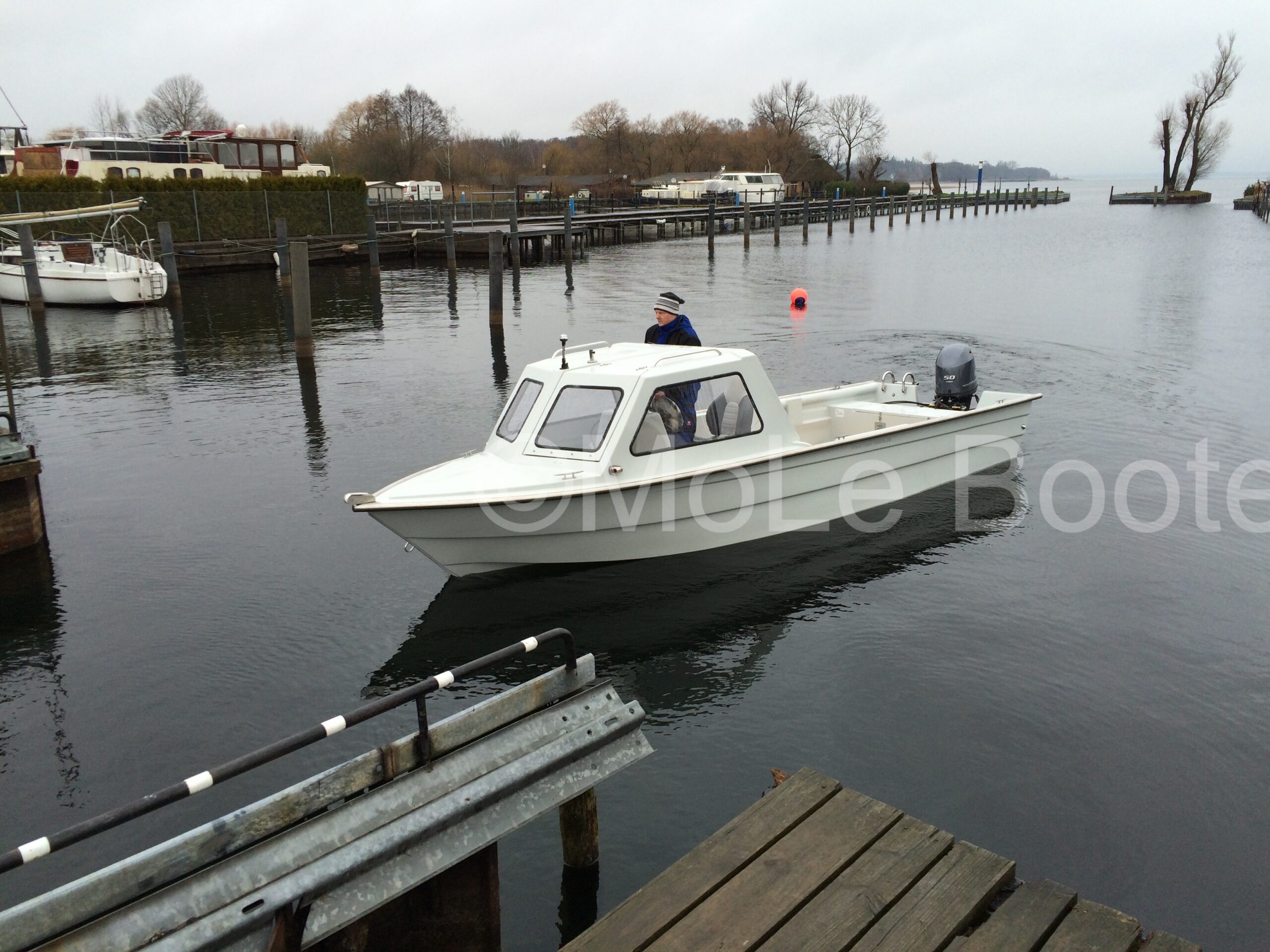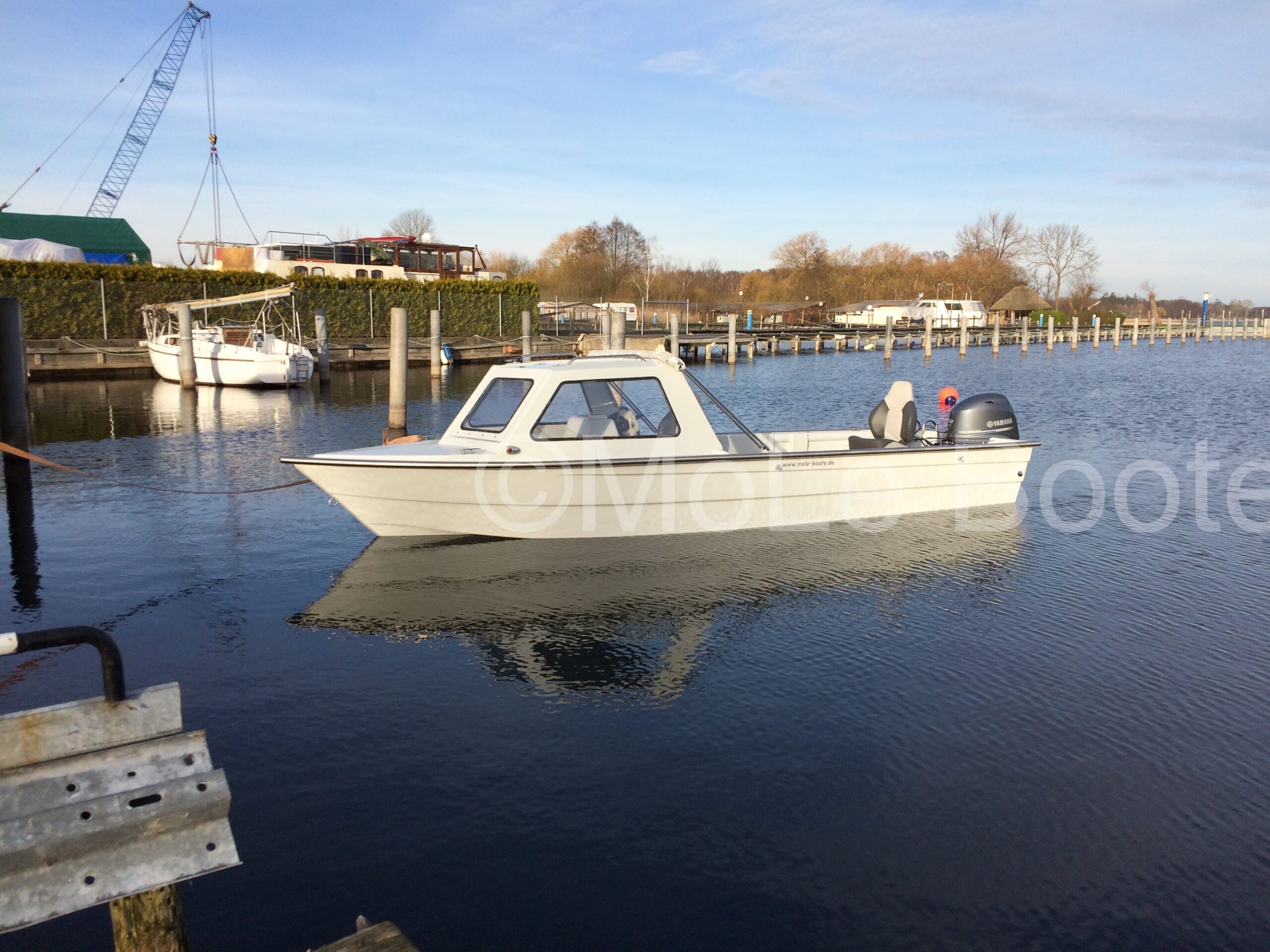 Das Modell Fischer K ist ein Kajütboot mit Schlafkabine mit festem Dach und Fronteinstieg. Multifunktional lässt sich dieses Boot auch mit Persenning als geschlossenes Kajütboot und auch mit Standheizung erweitern. Die Basis für dieses Modell bildet unser beliebtes Modell MoLe Fischer mit Knickspantrumpf und 2 Führungskielen. Der Spiegel ist verstärkt und somit für Aussenbordmotoren bis 70 PS nutzbar.